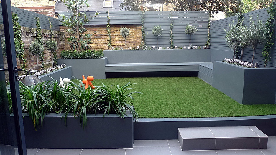 Modern Small Garden Design Artificial Grass Raised Beds Painted